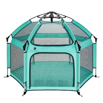 Indoor and outdoor playpen with pop up design. Lightweight and UV protective. The product we rent may vary by brand, model, or color.